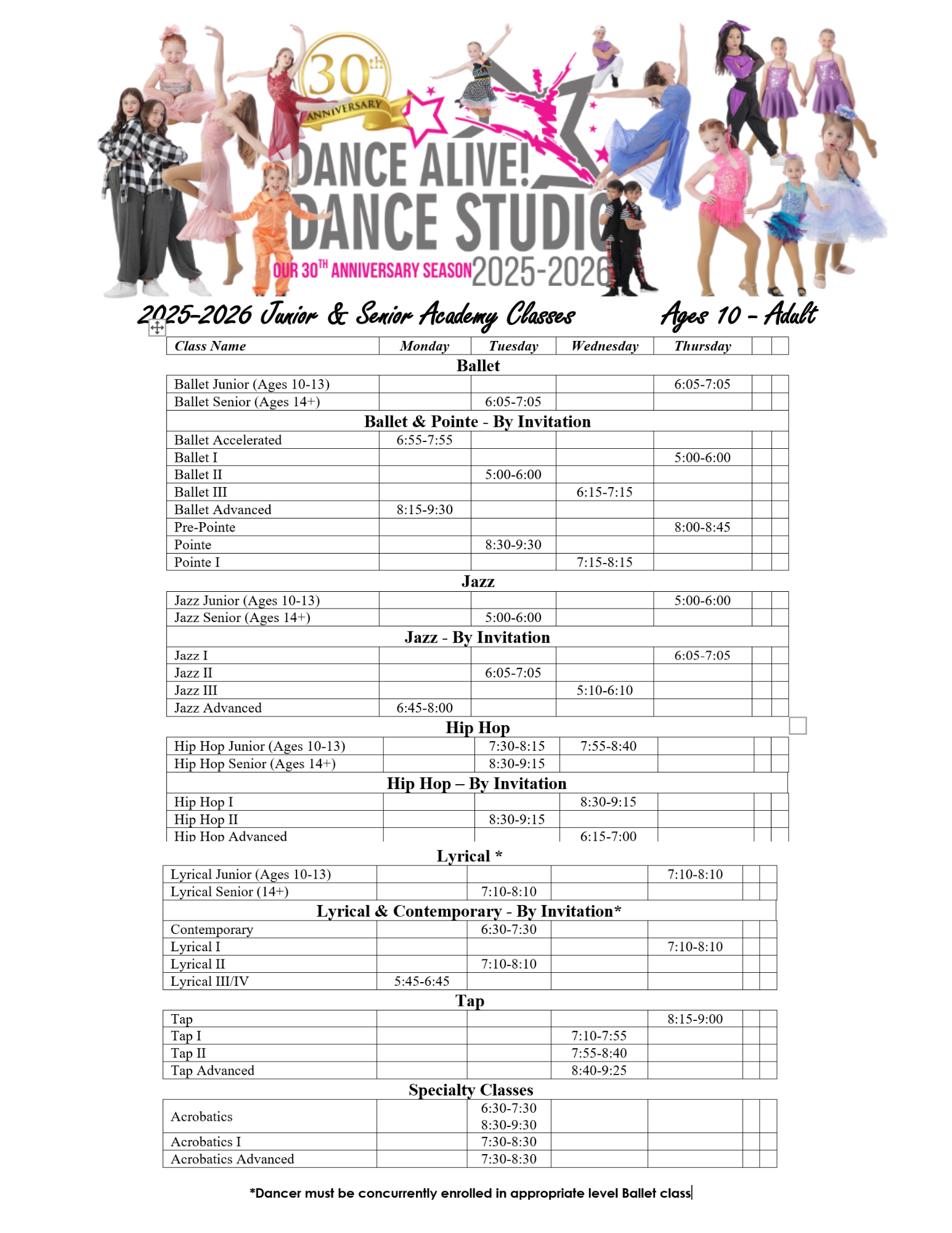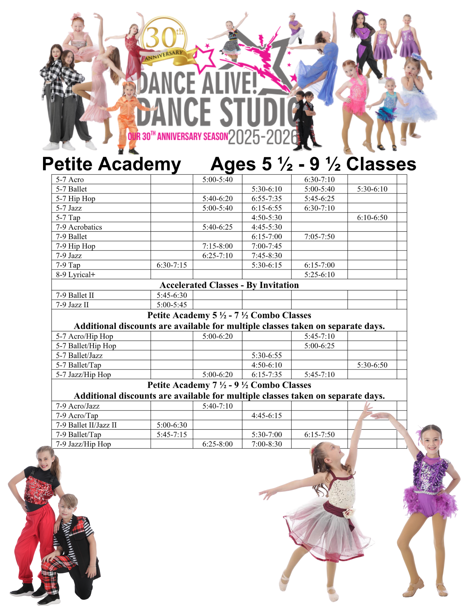 Beginning with Dance with Me for the youngest of movers and growing through the most advanced levels in Ballet, Jazz, Hip Hop, Lyrical, Acrobatics, Tap and Contemporary dance – we have a class for your dancer to THRIVE in!